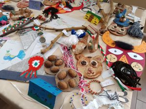 A kézműves tanszakunk egy kiállítással mutatta meg az eltelt hónapok alatt létrehozott alkotásokat. Sokféle anyaggal dolgoztak a gyerekek és sokféle technikával ismerkedtek meg.A kiállító asztal megtelt szebbnél szebb tárgyakkal. Semmi műanyag és villogó, zenélő játék, hanem a természet adta anyagokból készült, a gyerekek fantáziáját igénybe vevő hasznos dolgok születtek.
